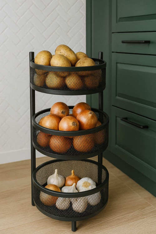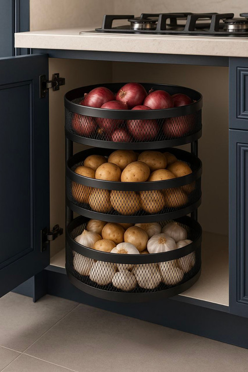 جاپیازی گرد چرخشی توری از جنس مقاوم آهن و پایه های لوله آهن و دیواره های فلزی توری که همگی رنگ مشکی کوره ای شده اند ، با قابلیت چرخش و بازشدن طبقه ی وسط به بیرون برای سهولت استفاده از آن