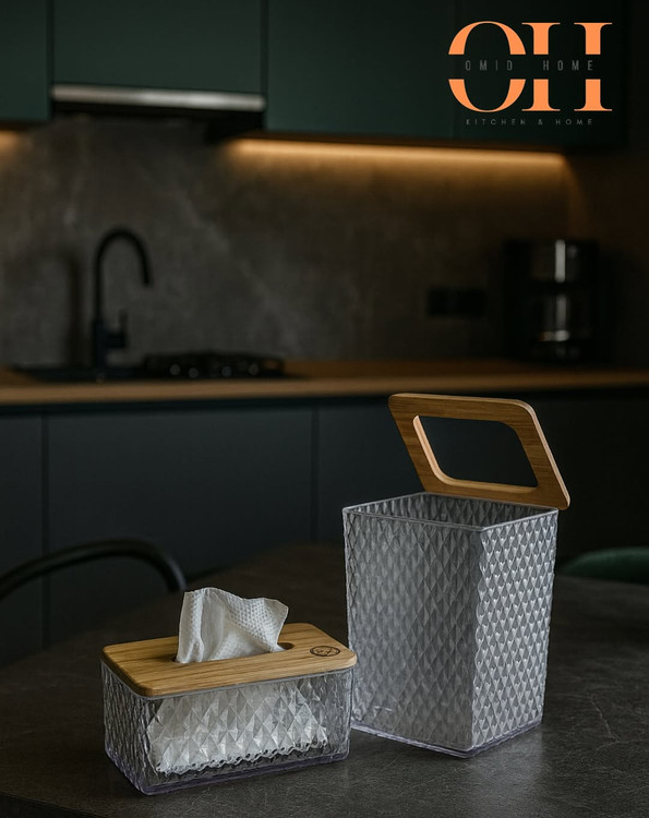 یه ترکیب شیک و خاص از چوب و کریستال سطل کاغذ کریستال الماس درب چوبی طراحی لوکس، مناسب دکورهای خاص و مرتب.