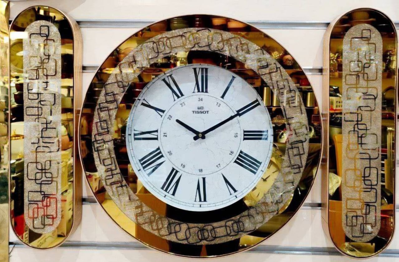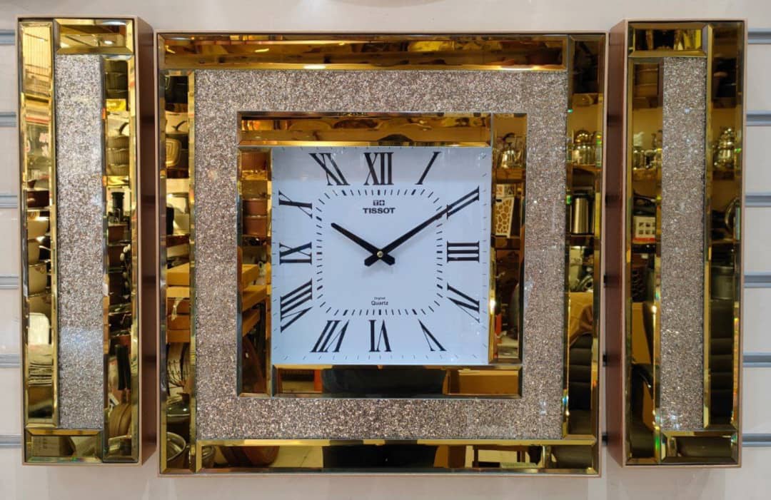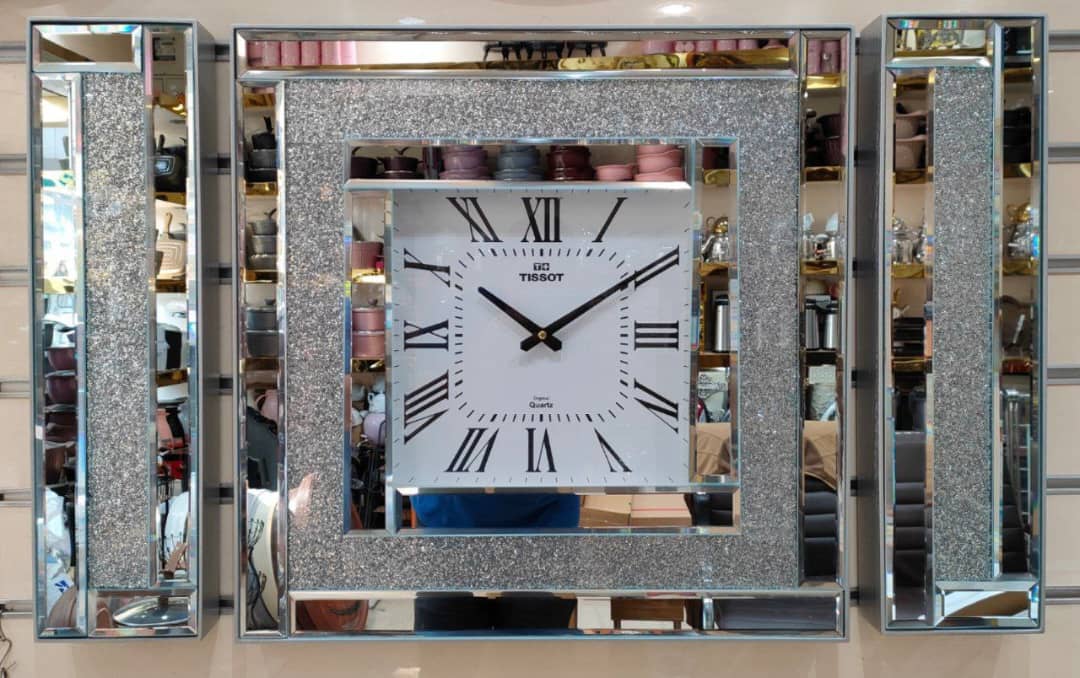 ساعت دیواری آینه ای برند تیسوت باکس دار (گوشواره ای ) در دو مدل گرد و چهارگوش و دو رنگ طلایی و نقره ای